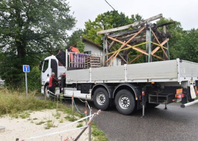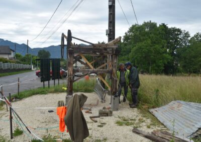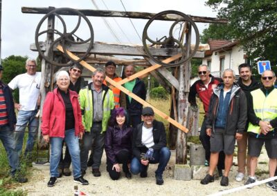 Avec la complicité de l’entreprise Barel et Pelletier, son chauffeur Eric est venu avec l’aide d’une grue, déposer ce patrimoine avec précision sur les 4 plots de ciment parfaitement positionnés par Michel, Marc et Alain.
